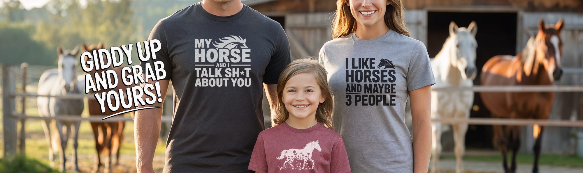 From punny prints to designs that holler “Hay Girl” and “Talk Derby to Me,” we celebrate horse life with humor, heart, and a little hay-dust sparkle. So tighten your cinch, grab your favorite tee, and ride out in style—because you can take the rider out of the barn, but you can’t take the barn out of the rider.